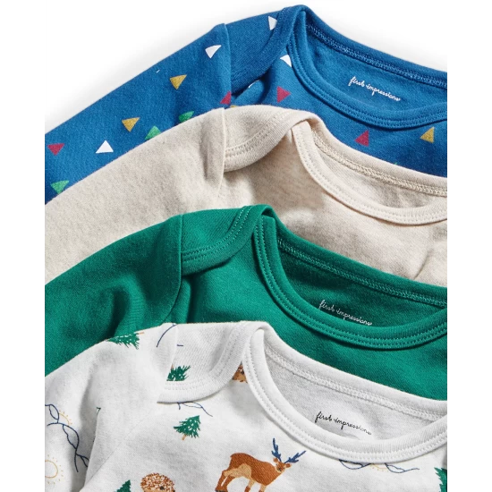 - Pack of four bodysuits, two solid, one animal and forest print, one with an allover triangle print